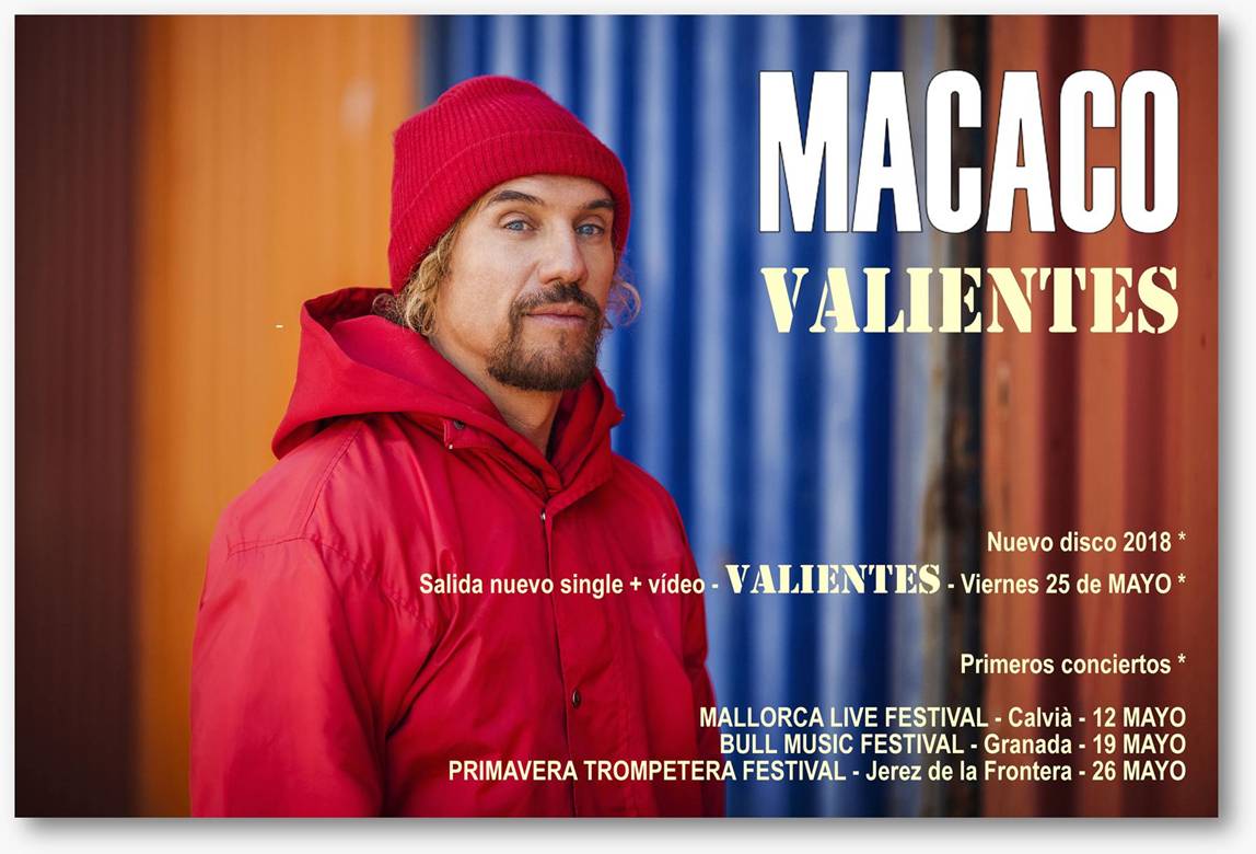 Macaco está ultimando la grabación de su nuevo álbum BACK TO THE JUNGLE, que verá la luz a principios de 2019. El primer single adelanto extraído de este álbum se titula VALIENTES y se lanza junto a un impresionante videoclip/película protagonizado por el actor Alberto Ammann el próximo 29 de Junio en todas las plataformas digitales.
